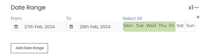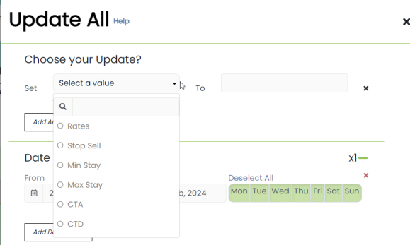 Supply a date range (max. 2 years at a time) and select the days of the week to apply the update to