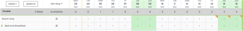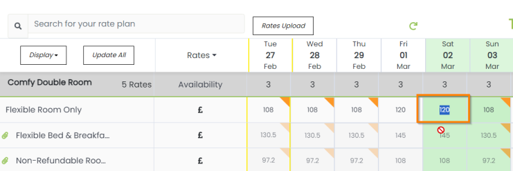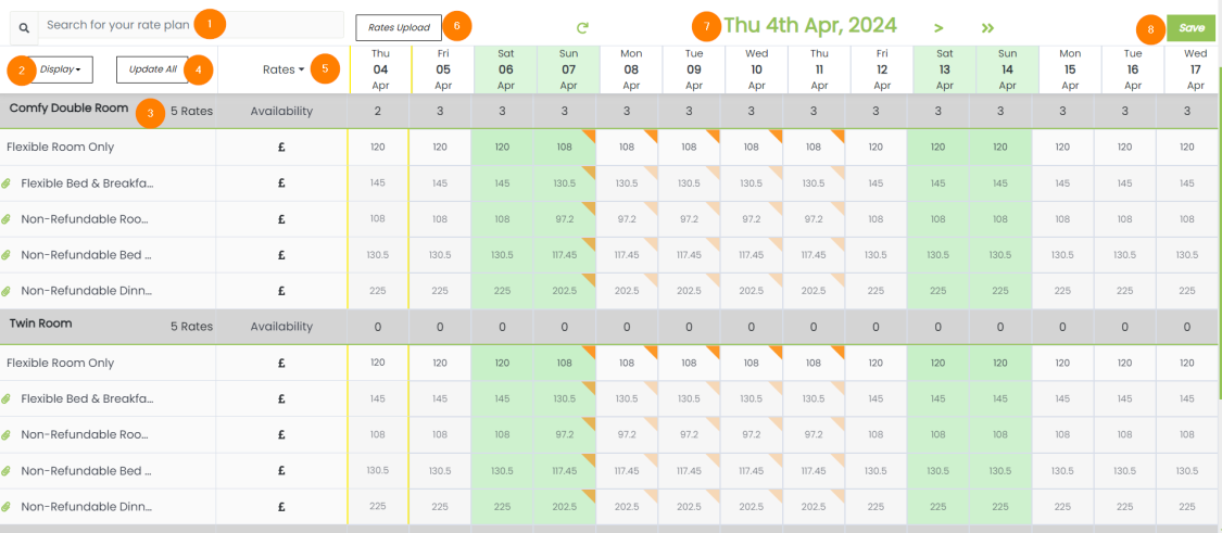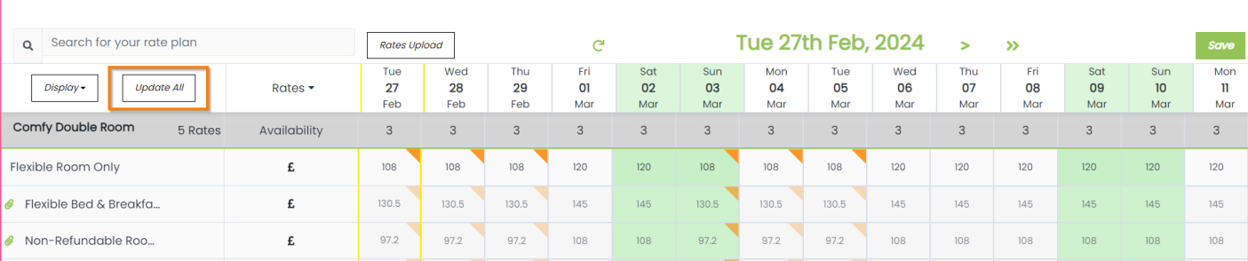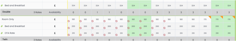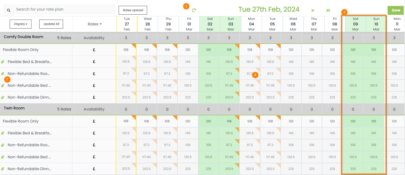 The Grid will, by default, show the daily rates for all rate plans in the PMS. Rates for individual days can be updated by entering a new value in the cell and pressing save. Derived rates cannot be edited in this way, these are indicated by the green paperclips.