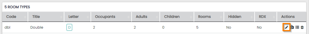 The action buttons located to the right will allow you to edit and update any room / room type. The actions include the following options: