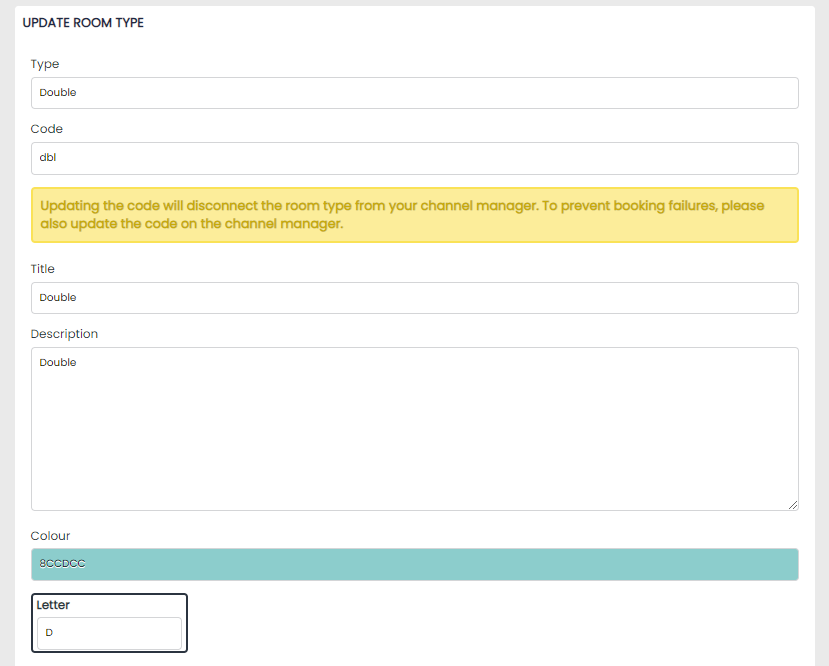 Due to the potential risks associated with editing your rooms, we would only recommend a hotelier access this area to make the following changes: