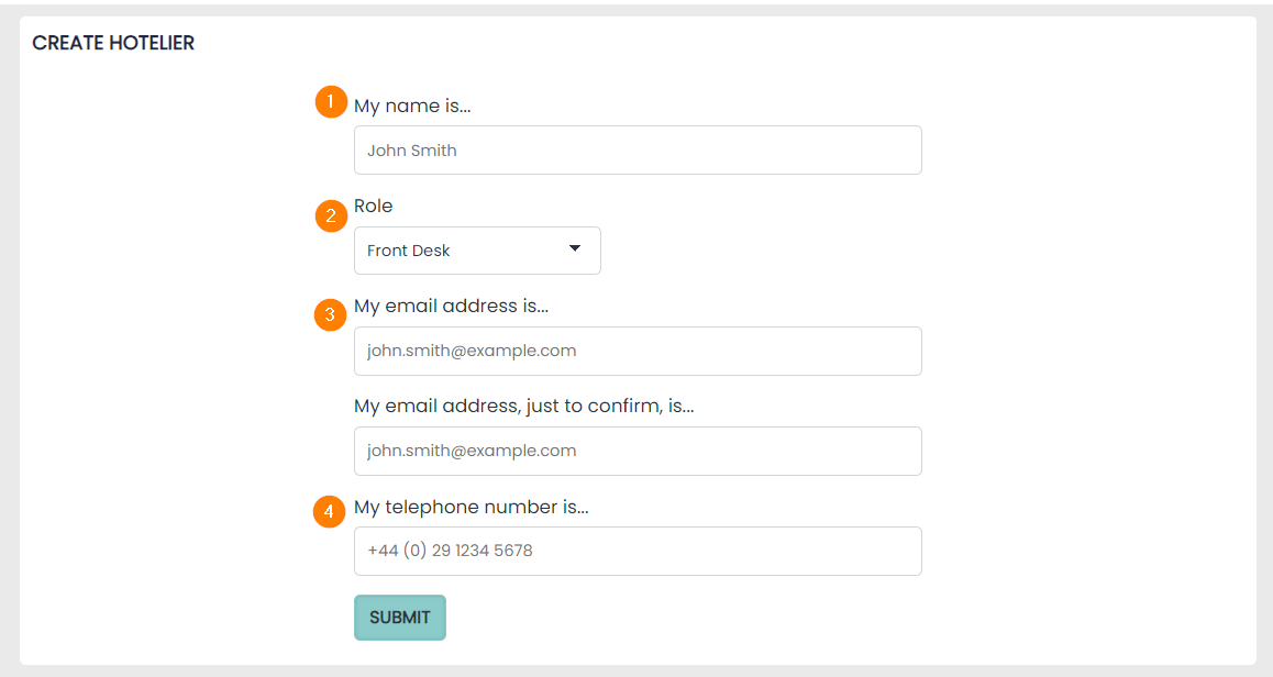 1 Create a New Staff Profile – a new member of staff can be created simply by providing a name and a unique email address