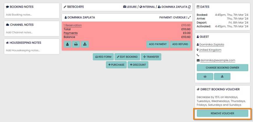 Vouchers can be removed from the booking after they have been applied. This is done by opening the booking itself and selecting the ‘Remove Promotion’ button to the right side of the screen.