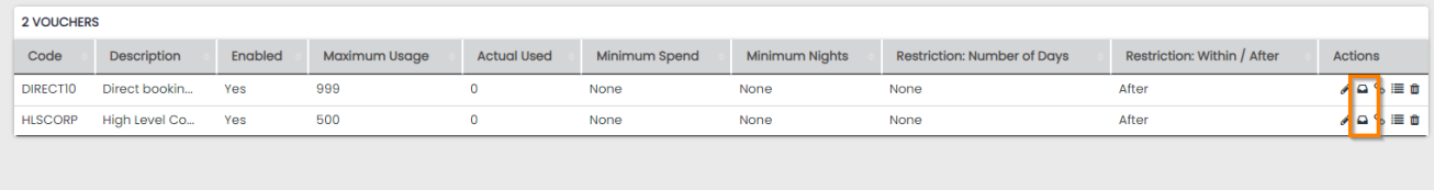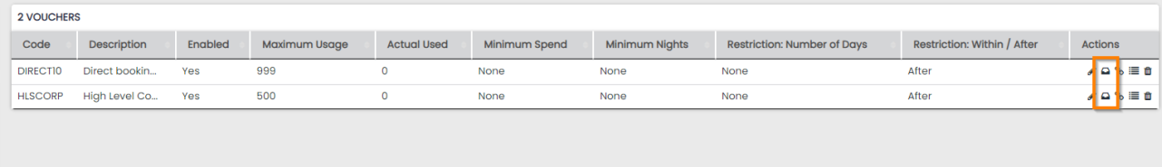 Hotel staff with permission can copy a voucher URL Link to share on social media as a call-to-action. This can be done by selecting the ‘Copy link to clipboard’ icon from the row of the relevant voucher’s ‘Actions’ after ‘Grid’, ‘Vouchers’ has been selected.