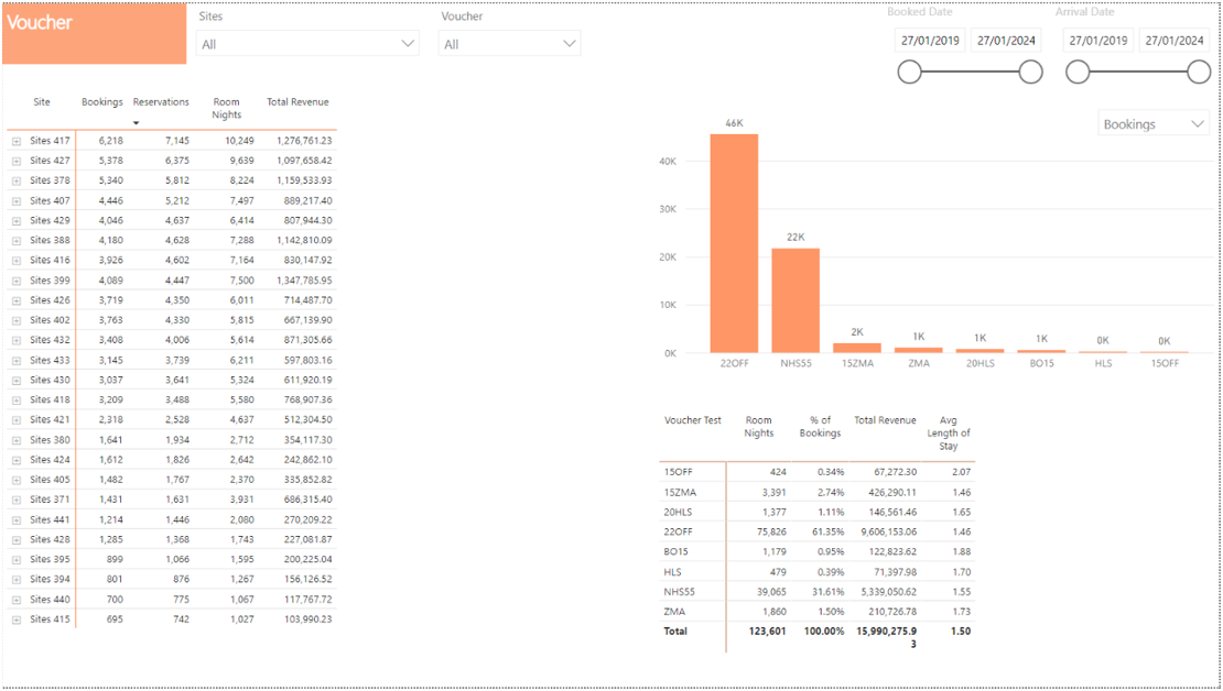 On the right hand side of the screen, you can see the current voucher Power BI dashboard displaying voucher usage across your estate and total revenue generated.
