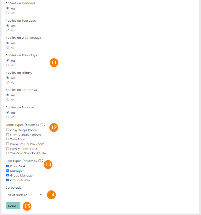 12 Room Type Selector – select the Room Types that you wish the discount to apply to. Multiple rooms can be selected.