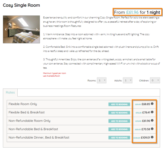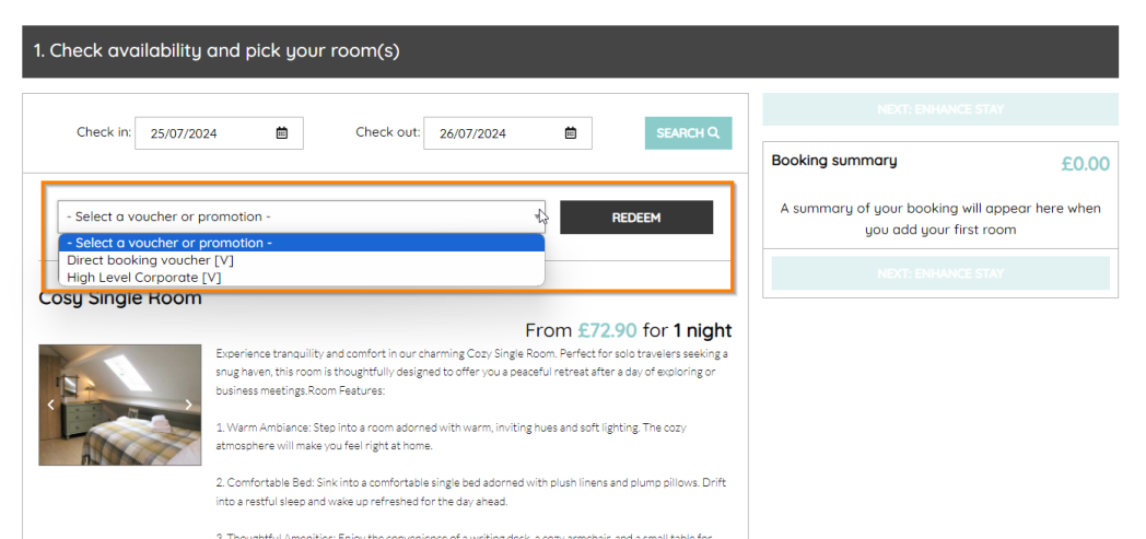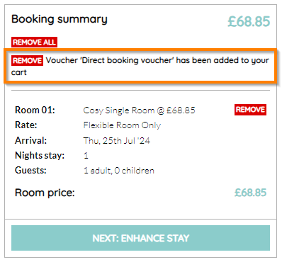 Multiple rooms booked with the same dates can be added and benefit from the same discount if the rooms have been associated with the voucher from the ‘Create a Voucher’ form.