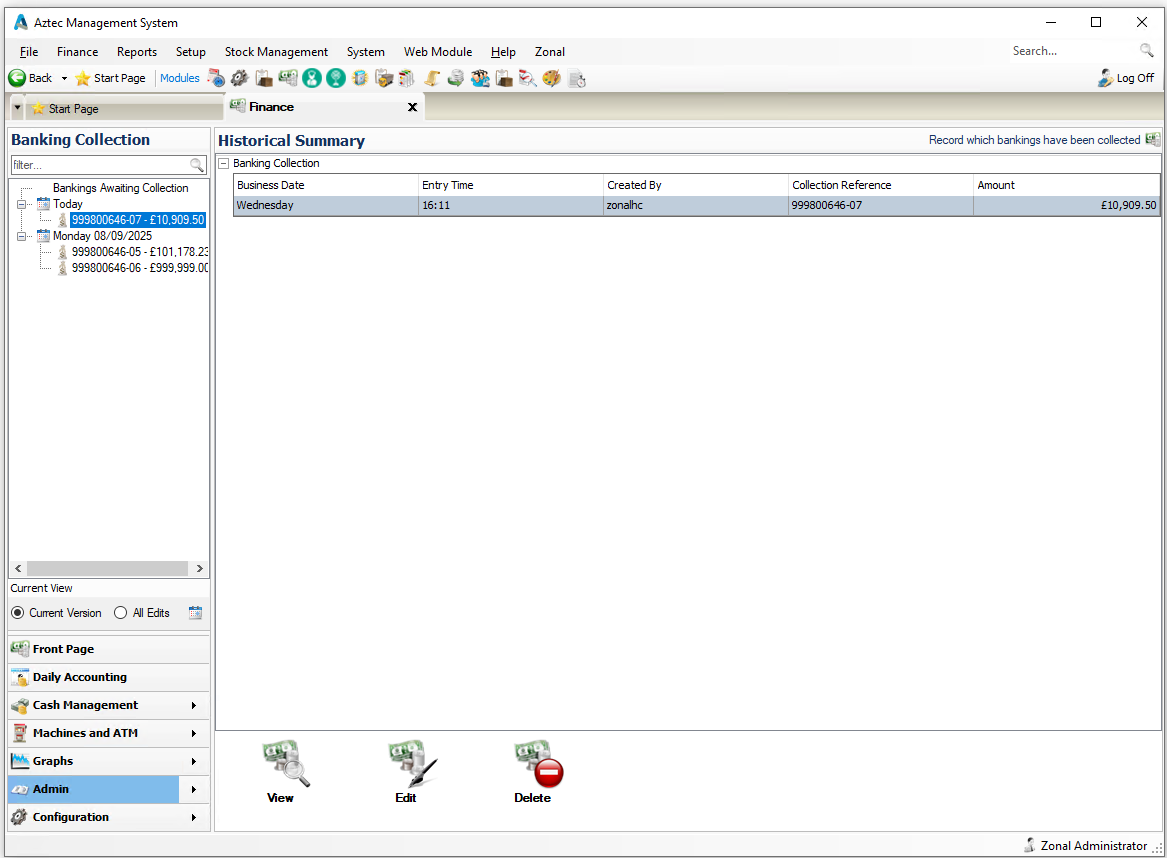When selecting a banking collection the list of entries are displayed by day and the options available are View | Edit | Delete