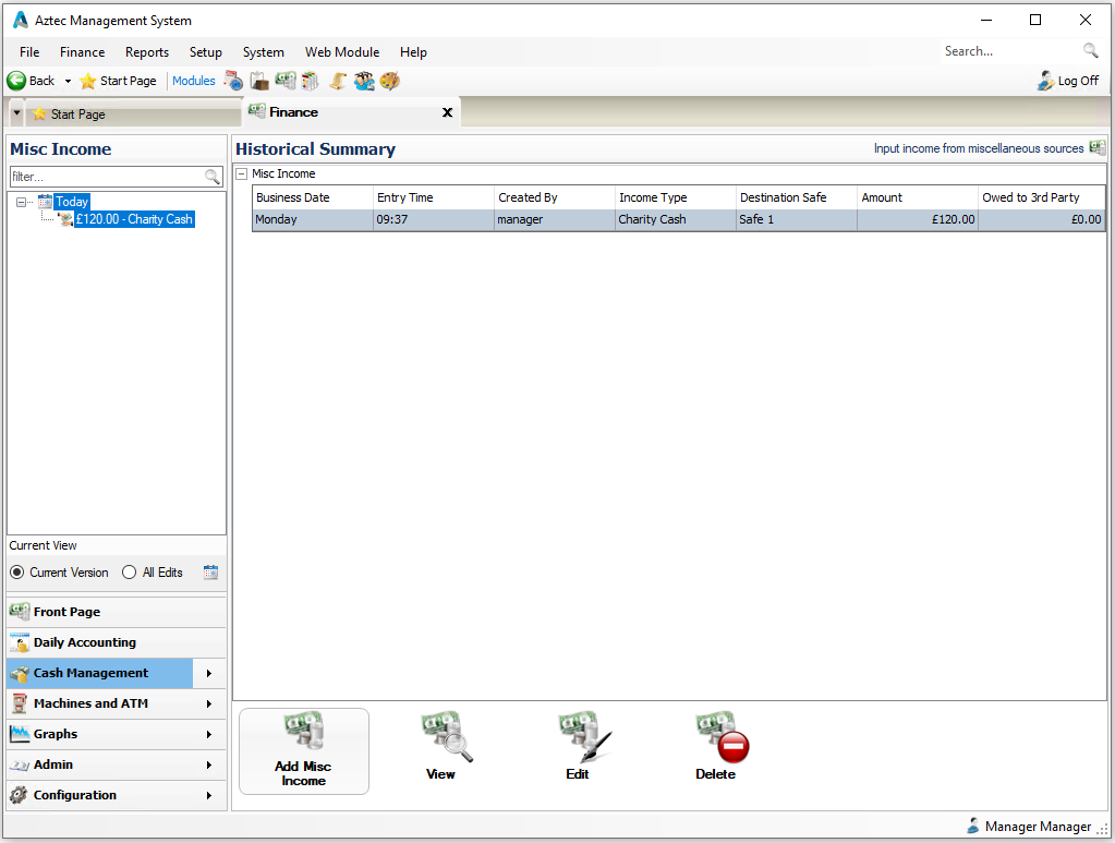 When selecting misc income the list of entries are displayed by day and the options available are View | Edit | Delete