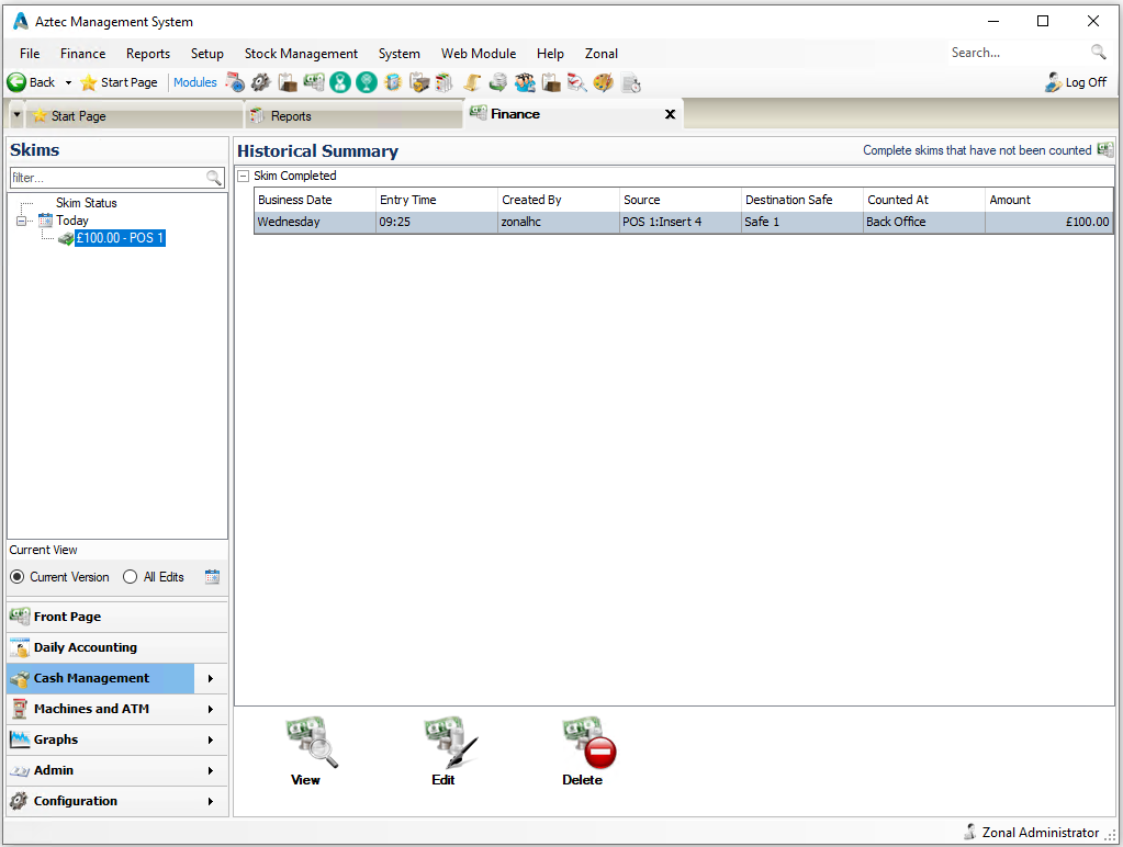 When selecting skims the list of entries are displayed by day and the options available are View | Edit | Delete