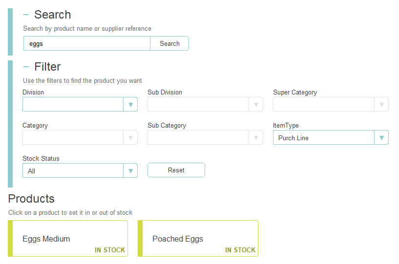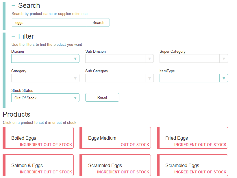 Applying a Stock Status filter of 'Out of Stock' will display all items currently out of stockIn this example as eggs were put out of stock and so all products containing eggs were also put out of stock
