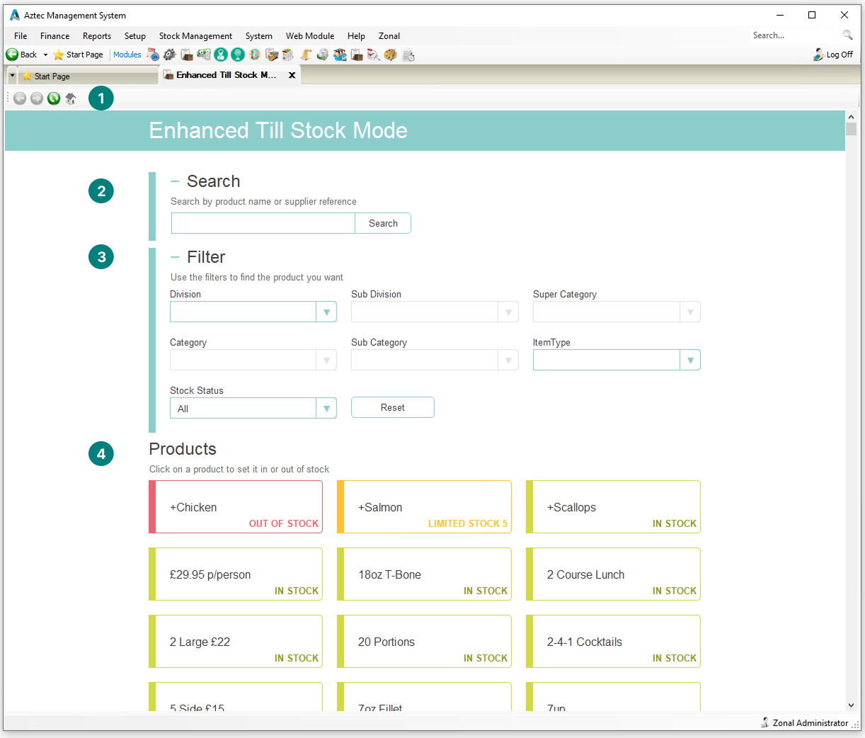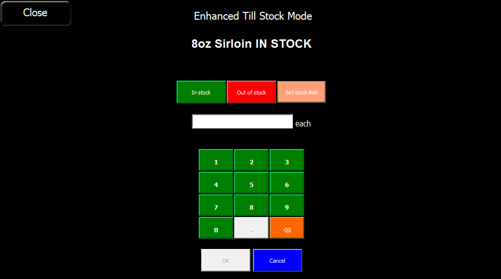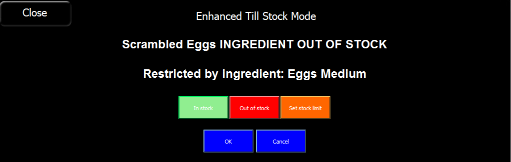 The enhanced stock mode option allows products to be marked as out of stock both at the point of sale terminal and in the back office. In this mode, operators can mark an ingredient as out of stock and the system will automatically mark as out of stock any products that use that ingredient.
