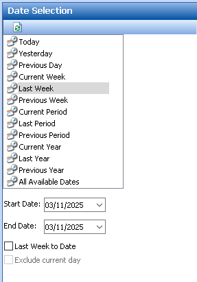 Selecting an alternative layout from the list will display when the report is opened Date Selection Depending on the report not all date options will be visible, some reports are designed to be per day / week only
