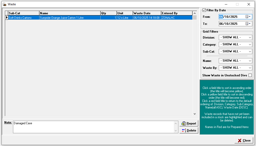 Select the required Waste Entry | click Delete | click Yes to confirm the deletion