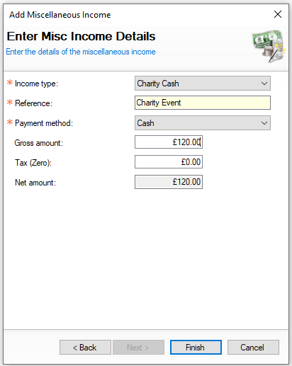 Select the Income Type → enter the Reference → select the Payment Method → enter the Gross Amount → click Finish