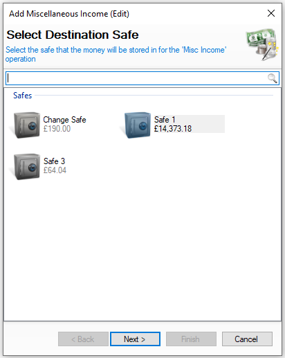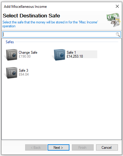 Select the required safe where money will be added to You will not be shown this step if: