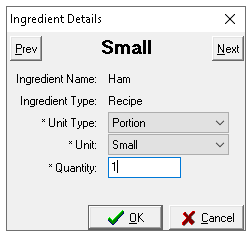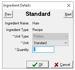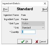 The Ingredient Details will be displayed for the Standard Portion