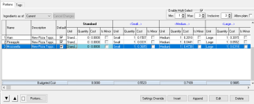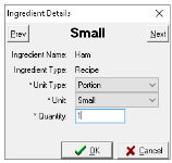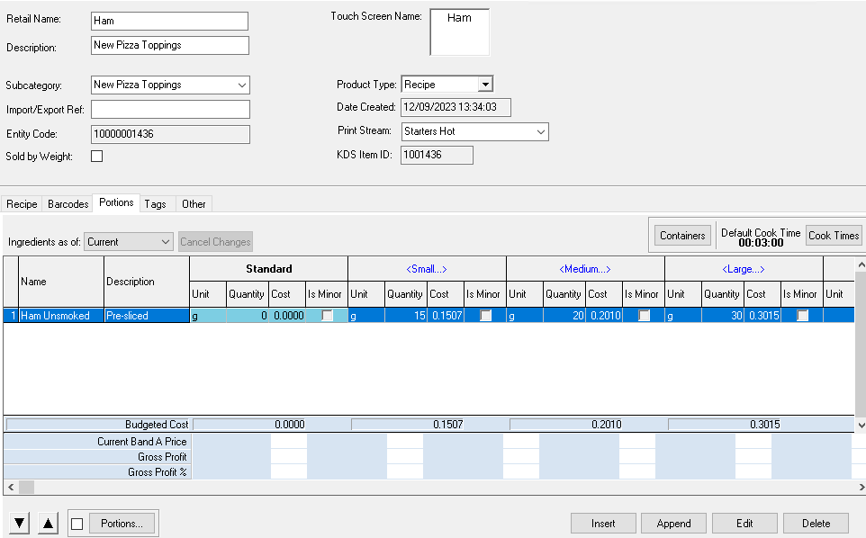 Example: A 'Ham' recipe with three portion sizes, each linked to a purchase line ingredient with different quantities. This ensures that when Ham is sold by portion through the choice, the correct stock reduction is applied automatically