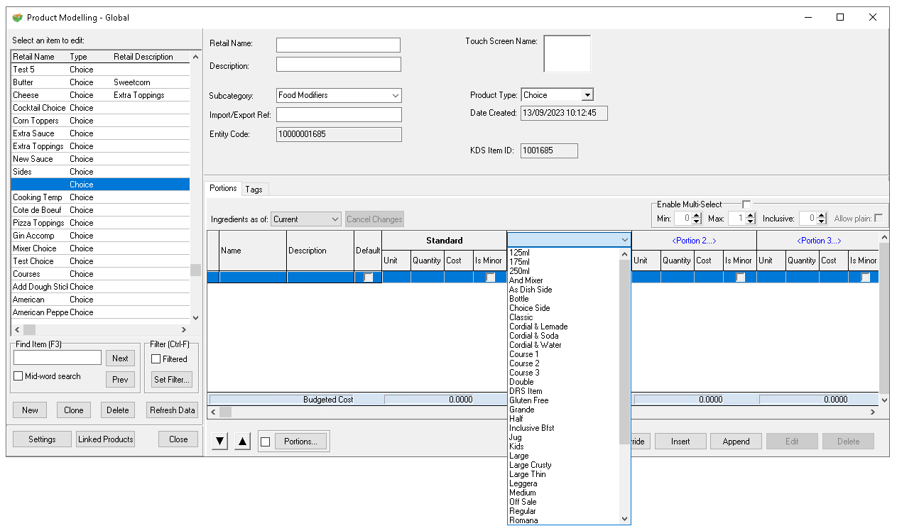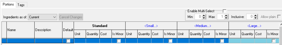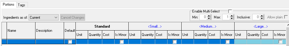 Each choice can include up to 19 alternative portions. Using multiple portions is an effective method for creating a single choice that can either be applied across multiple products or used to establish a direct mapping on standard line or recipe that is sold by different portions.