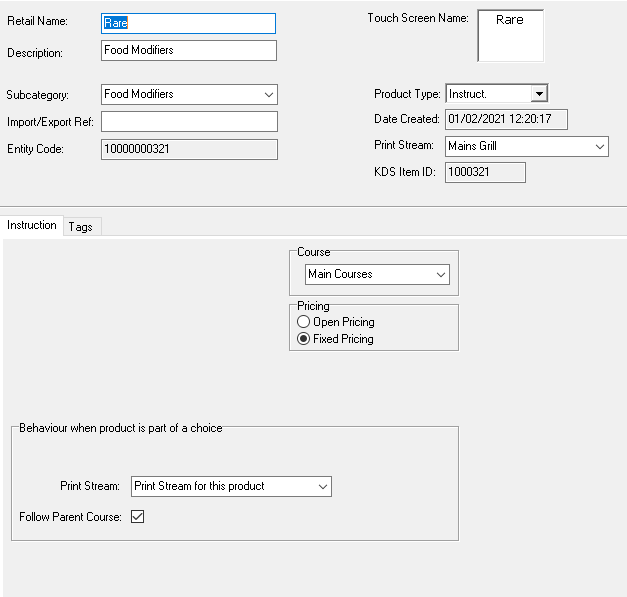 Name of the instruction displayed on point of sale terminals, when the button for this instruction is added to theme panel designs or shared panels it can be overridden If the product is part of a choice the name set against touch screen name will be used |