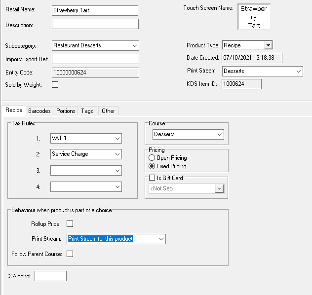 Name of the recipe displayed on point of sale terminals, when the button for this recipe is added to theme panel designs or shared panels it can be overridden If the product is part of a choice the name set against touch screen name will be used |
