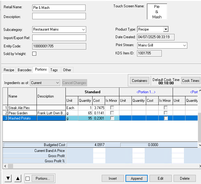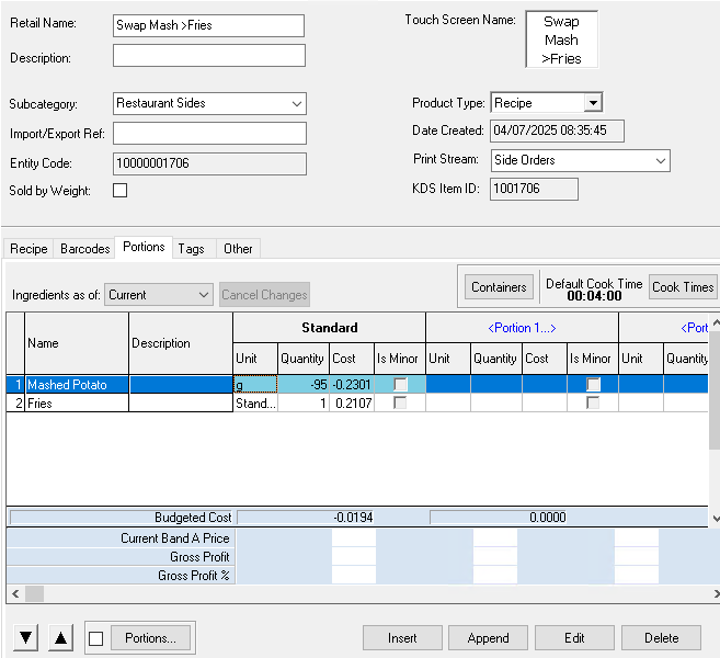 The final recipe has the standard quantity of fries and the minus value of mash, if required this swap product could be added to a choice with other options to swap