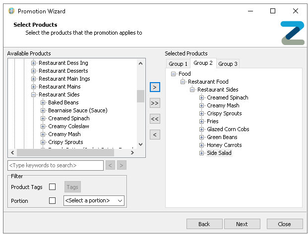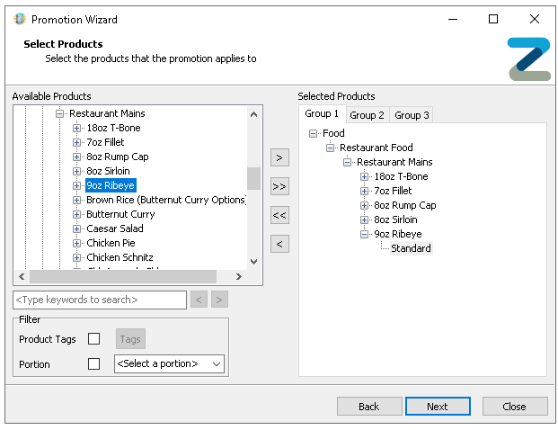 Expand the product hierarchy to make selections and use the arrow buttons to add the selected product levels, individual products and portions, or apply search and tag filters to make finding products easierAt least one product must be added per group before being able to continue -