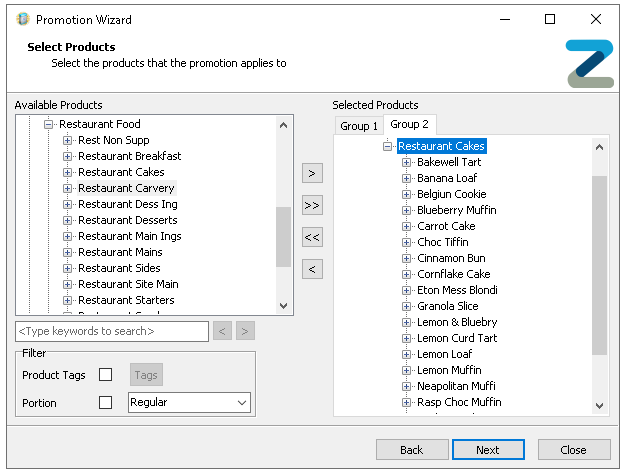 Expand the product hierarchy to make selections and use the arrow buttons to add the selected product levels, individual products and portions, or apply search and tag filters to make finding products easierAt least one product must be added per group before being able to continue -