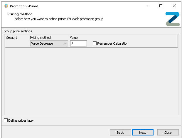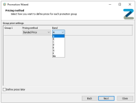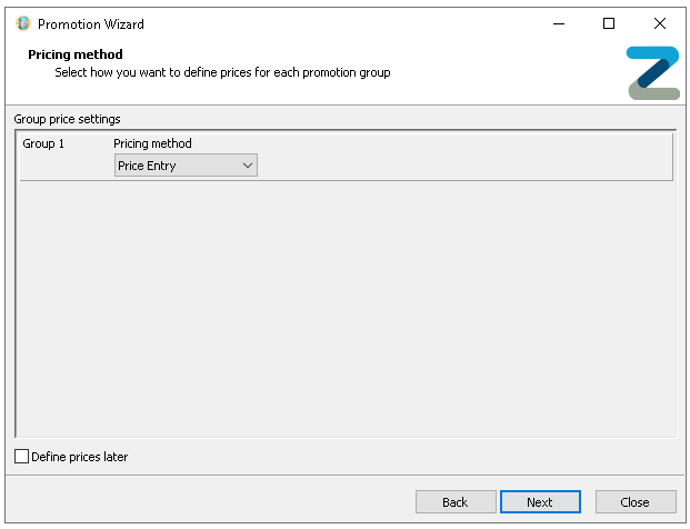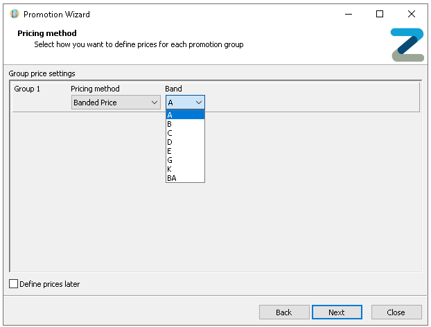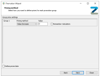 If prices are not yet available to be configured selecting 'Define Prices Later' will allow the promotion setup to be completed, the status of the promotion in the promotion list will be shown as Unpriced