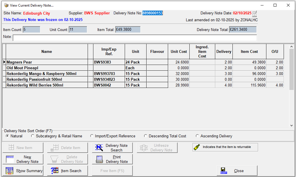In some organisations, where an auditor reviews delivery notes for accuracy, a note can be frozen. This means it is locked within the current stock period and can no longer be edited. During the audit process, product amendments can also be made to address missing items, incorrectly recorded items, or quantity errors.