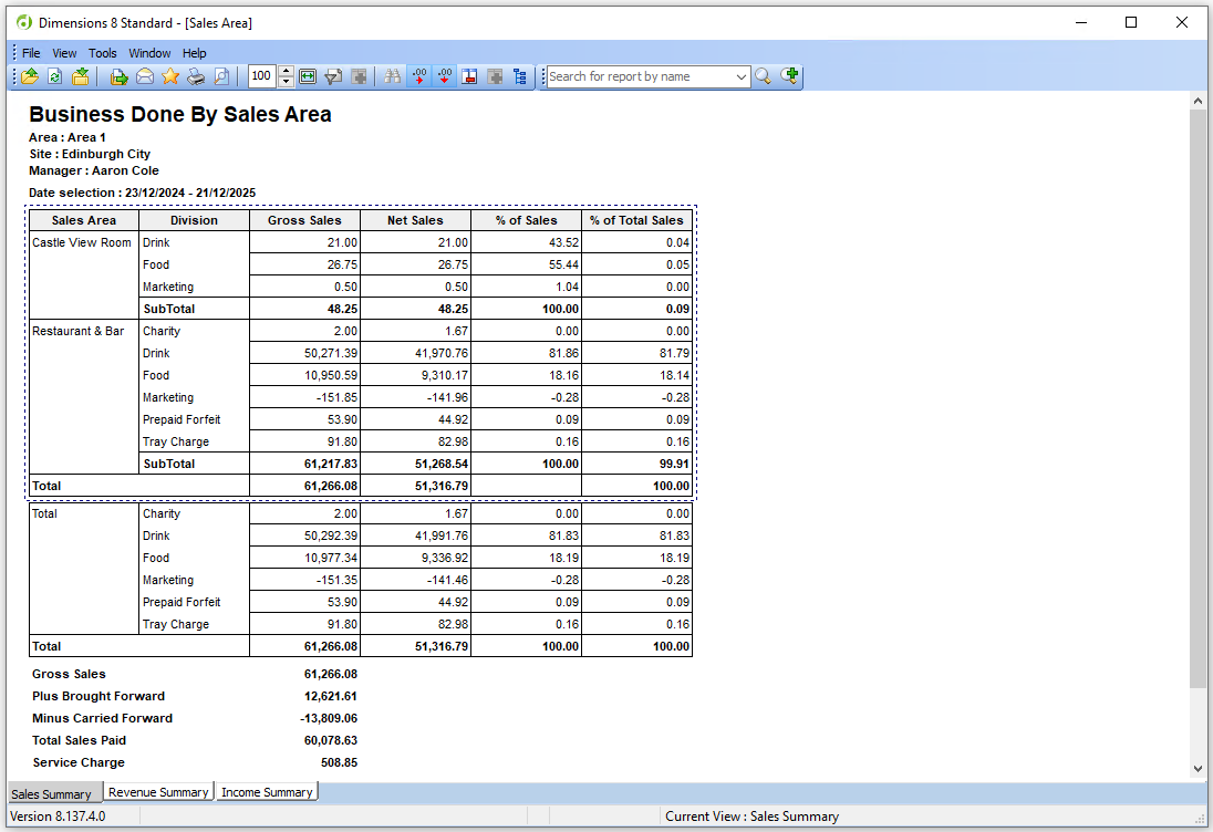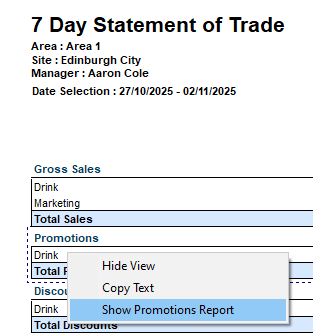 In this example the 7 day statement of trade has an option to 'Show Promotions Report' which will open and display the promotions report for the selected period