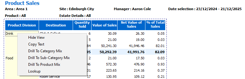 In this example, selecting the product division 'Drink' and 'Drill To Category Mix' applies a filter to only show related structure levels