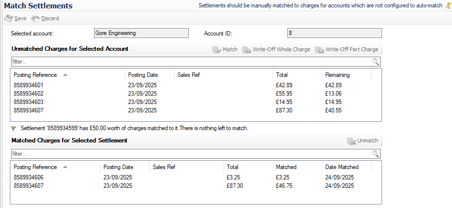 Settlement values might not always match those of the charges for an account, in this case partial matching can occur where a charge is either fully matched leaving an outstanding settlement value or the opposite where the settlement was not enough to cover the full charge amount.