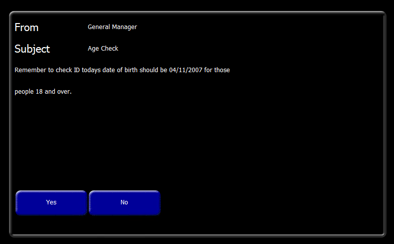 Any new messages will require a comms job to be run to send messages to siteThe message will automatically display on the point of sale terminal based on the settings configured