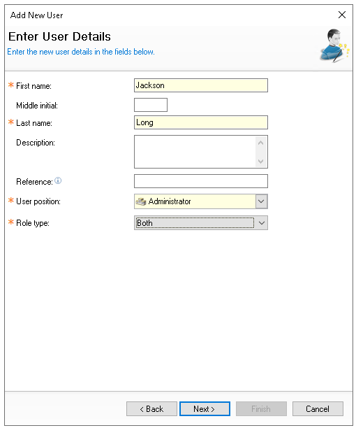 Enter the following user details, First Name | Middle Initial (optional) | Last Name | Description (optional)