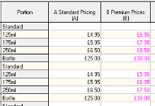 The price matrix is where all selling prices are maintained for both standard line and recipe type products. Each product and portion size is assigned a price within a specific price bands. The matrix consists of 702 price bands, ranging from A to ZZ.