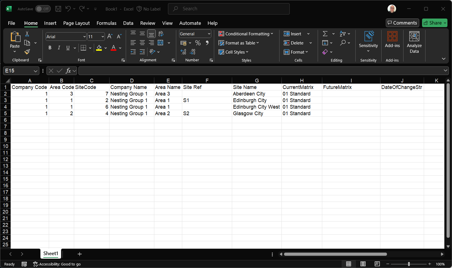 Care should be taken not to change any data in the columns A-H as this information is needed when re-importing back to the site matrix, any changes could cause the import to fail -