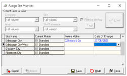 As an alternative to managing future changes directly within the site matrix, the data can be exported to a spread sheet, adjusted as needed, and then re-imported into the system.