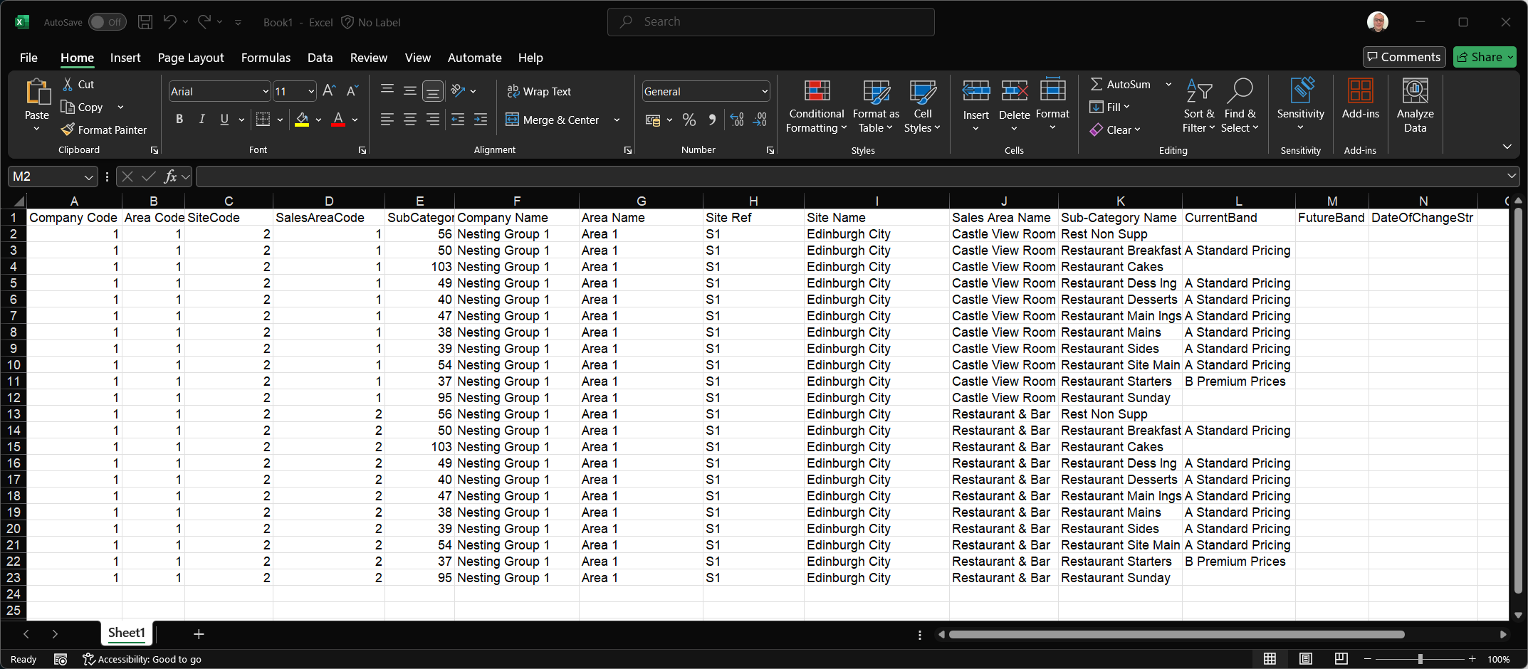 Additional columns will be displayed when pasted into the spread sheet compared to viewing the sales area banding screen -