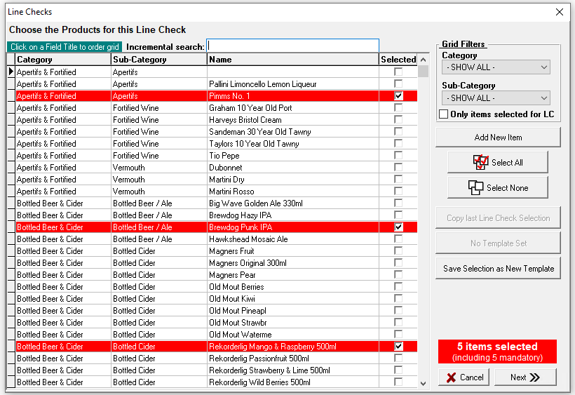 Any products displayed in red are those that are defined as the required mandatory line check products, additional items can be added as required -