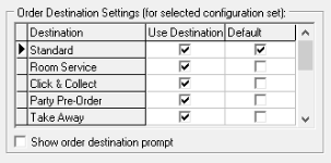 Order destinations are used to classify different types of orders based on where they will be consumed by the guest. Per config set the required destinations can be enabled.