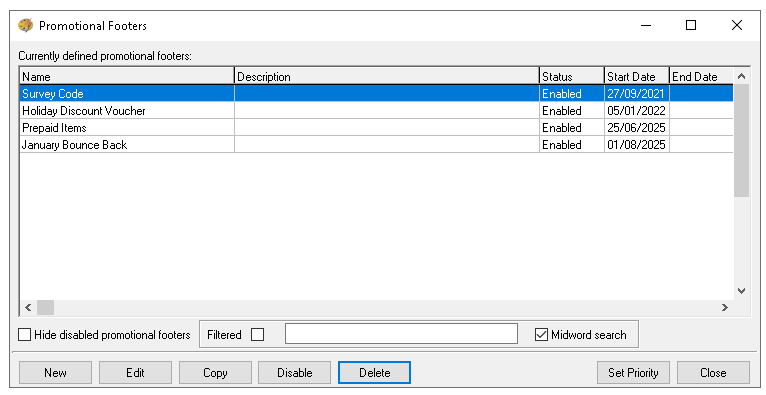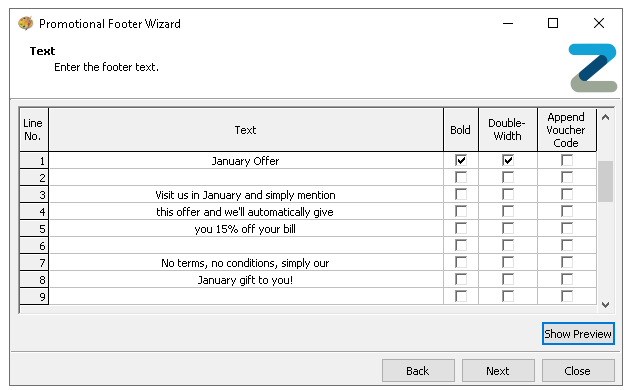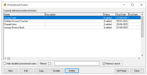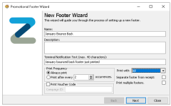 Promotional Footers are automated printed footers that are triggered by a set of criteria, which could be for bounce back vouchers, additional information and feedback codes, this page includes the setup process for footers.