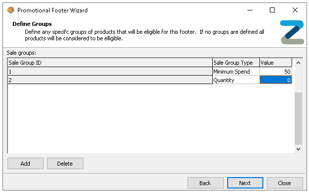 Clicking add will create a sale group where selected products can be assigned which must be ordered for the footer to be activated-