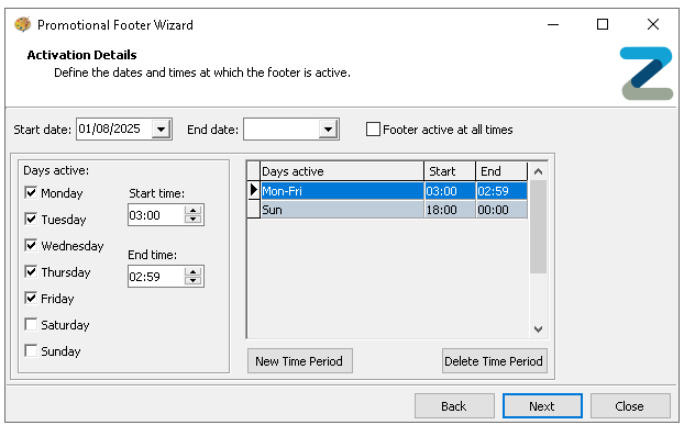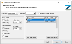 By default the start date is set to current days date and the footer is active at all times, deselect 'Footer active at all times' to create specific days / times and other time period settings -