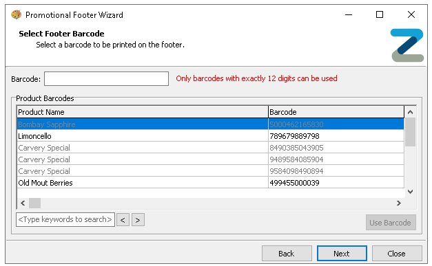 Products displayed in the list in black can be selected and then clicking 'Use Barcode'