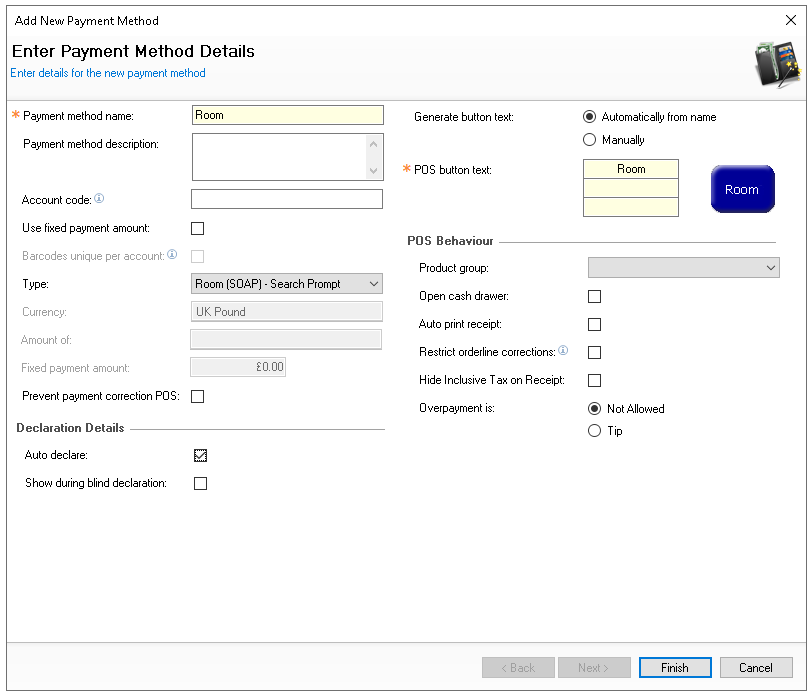 Tip - when set a POS operator can over tender the amount to charge to the room and any difference would be posted as a tip