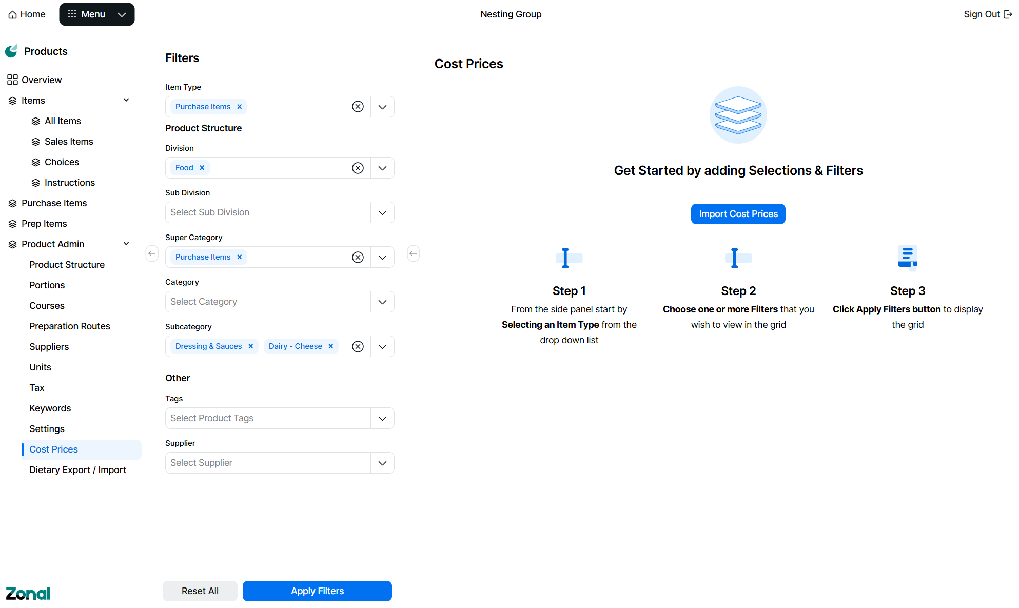 Click Apply Filters | the cost price grid should now be displayed based on the filter criteria selected