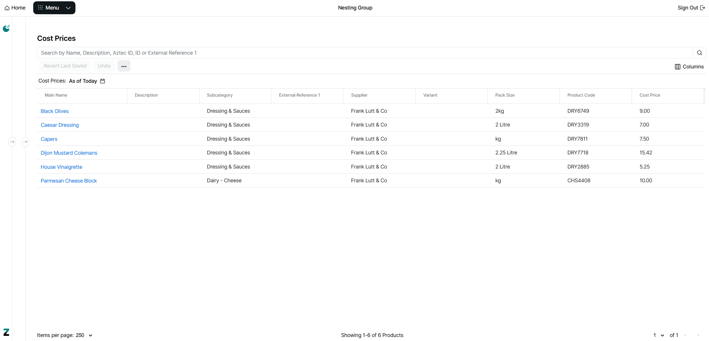 When suppliers update their prices, cost prices for purchasable sales items and purchase items can be managed and updated in bulk within the Cost Prices section.