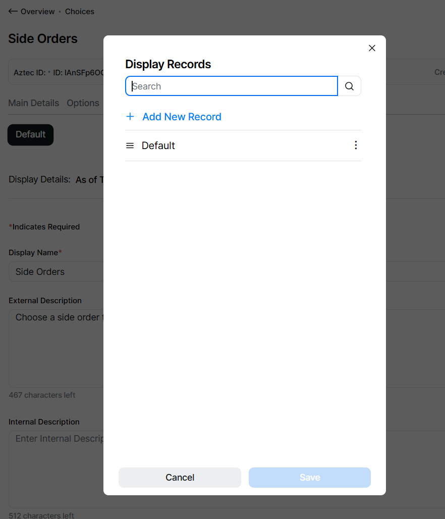 Each new choice created will automatically be added with a default record, which is shown in the display details tab.