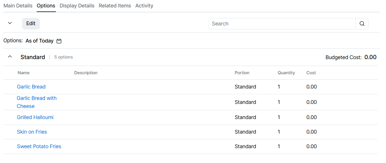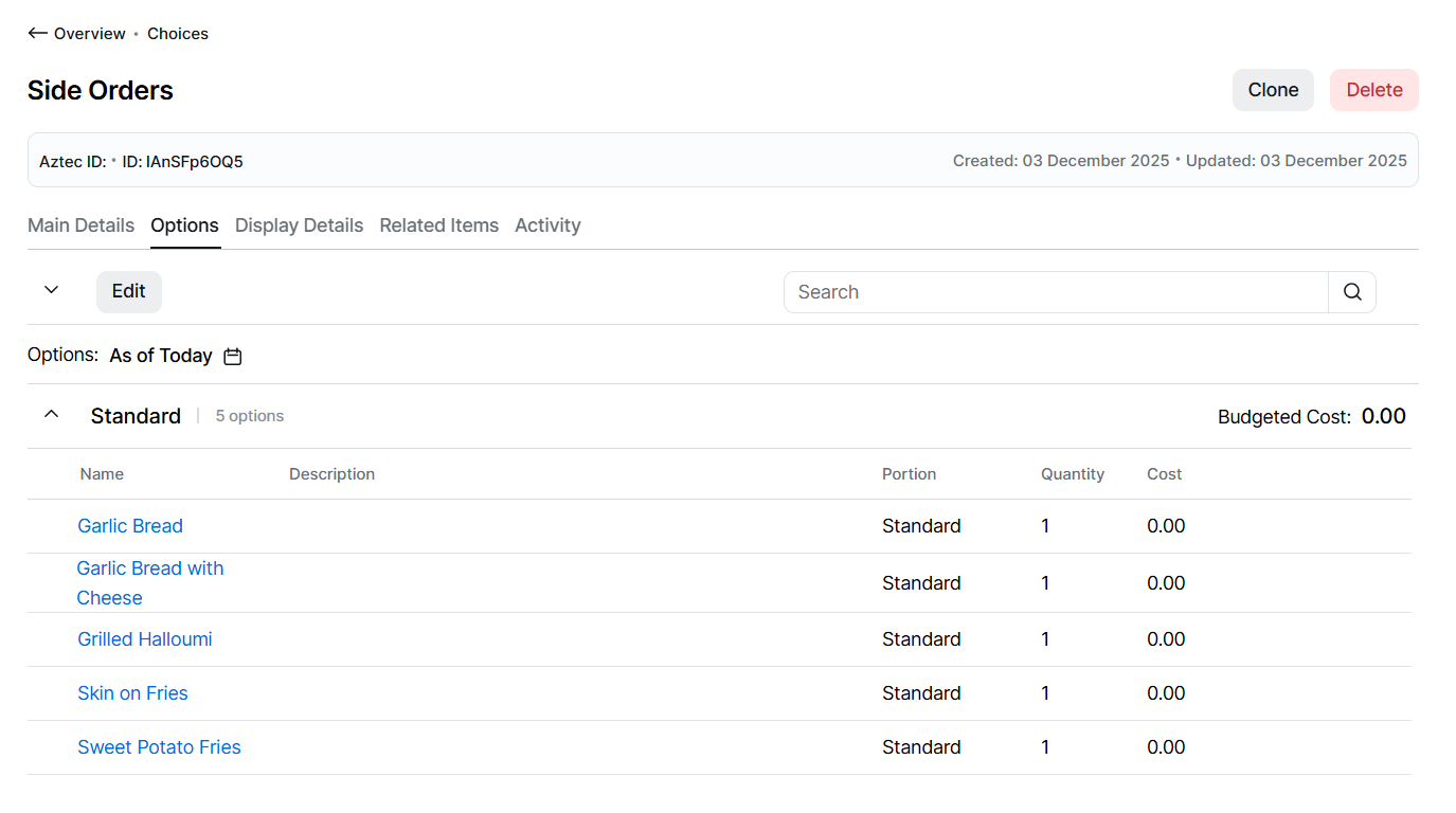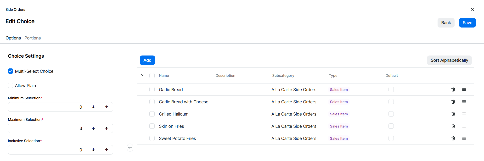 The second section when configuring a choice are the options, these are the items that can be selected when the choice is displayed during the ordering process.