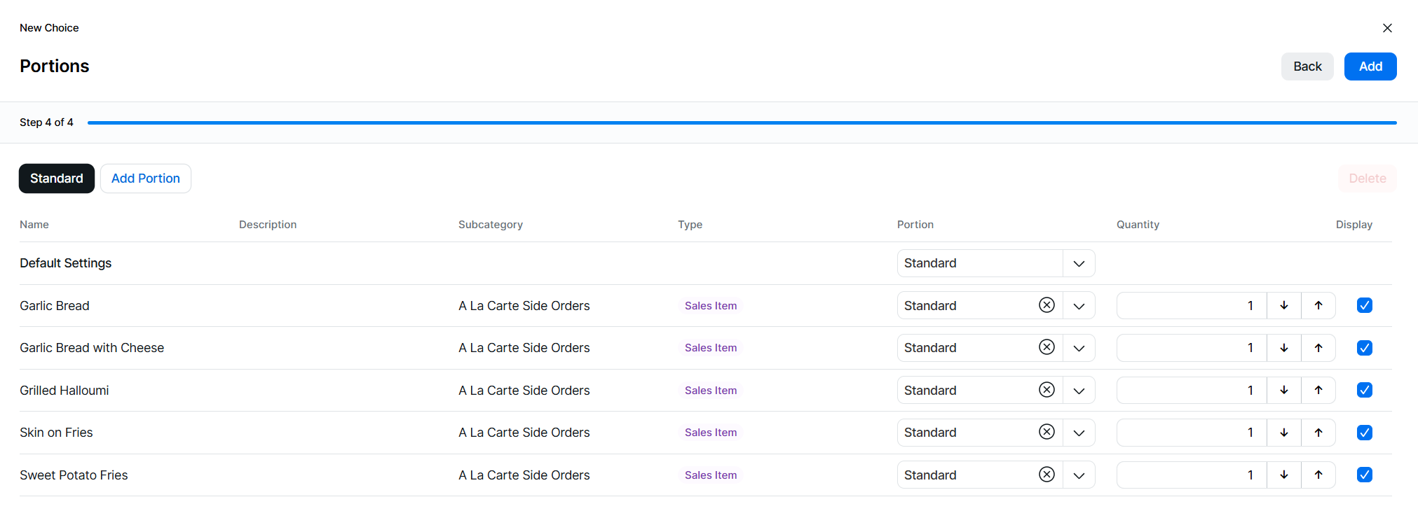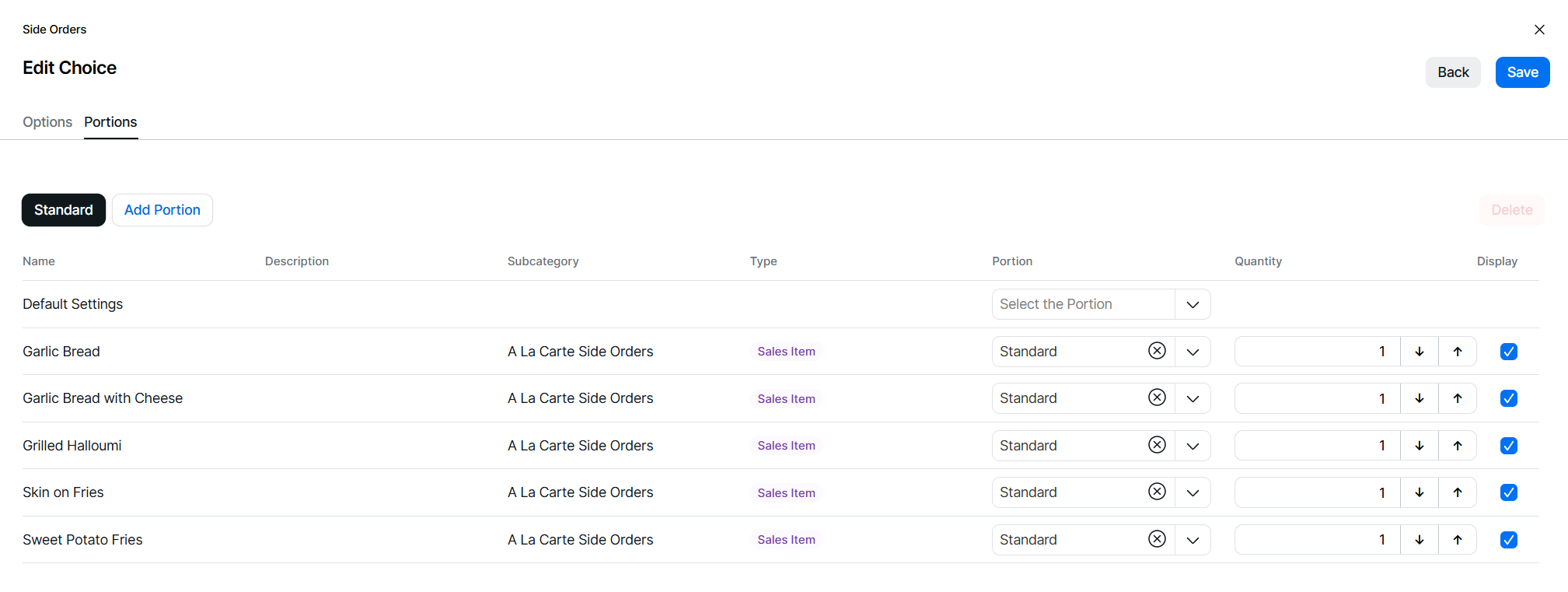 For each option added (sales item and choices) select the required portion from the drop down, if all the options use the same portion use the "Default Settings" drop down to apply to each row